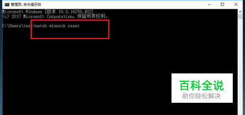 第二步打开命令提示符之后,输入“netsh winsock reset”命令,如下图所示: