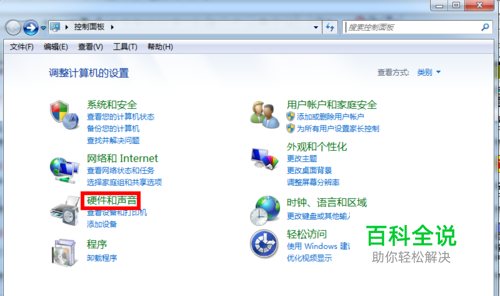 点击“硬件和声音”,进入控制界面,找到声音控制项目。