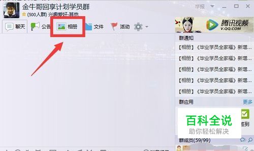 在qq群的聊天模式下面,我们可以看到上方有一个相册,点击它,如图所示。