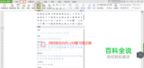 然后点击上面菜单栏上的插入-形状-基本形状 选中椭圆,然后同时安装键盘上的Shift+Ctrl键,并在空白区域可绘制出正圆。