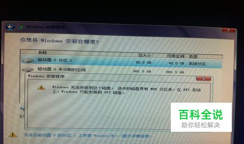 安装时,提示如下,系统无法安装在具有MBR分区表磁盘