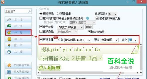 进入搜狗拼音输入法设置界面后,点击【外观】右边有一个【更换字体】的复选框勾上它。然后就可以设置你想的字体,字体大小。