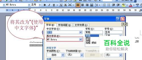 第二步:点击格式->字体,弹出对话框。找到“西文字体”将“MT Extra”改为“(使用中文字体)”