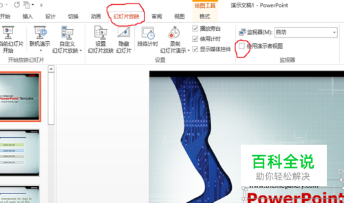 点击鼠标选择最上方tab页的<幻灯片放映>子页,如下图所示,然后选中<使用演示者视图>前的复选框,该选项是使用演示者模式的必选项。
