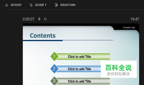 选择左方菜单中的<从头开始>或者<从当前幻灯页开始>开始播放PPT,这时候投影仪上就开始全屏播放PPT