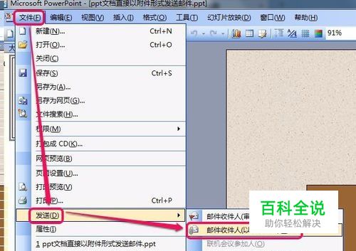 选择“文件”菜单中的“发送”项,进一步单击下一级菜单里面的“邮件收件人(以附件形式)”命令。