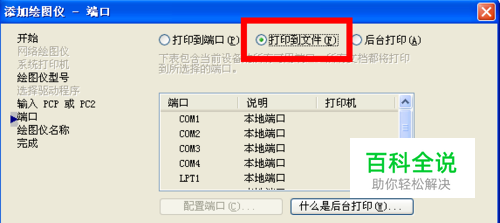 第七步: 在弹出的“添加绘图仪-端口”窗口中,选择“打印到文件”,点击“下一步”。