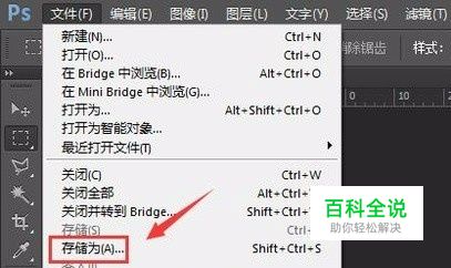 点击文件菜单,在其子级菜单里找到存储为选项,如图所示: