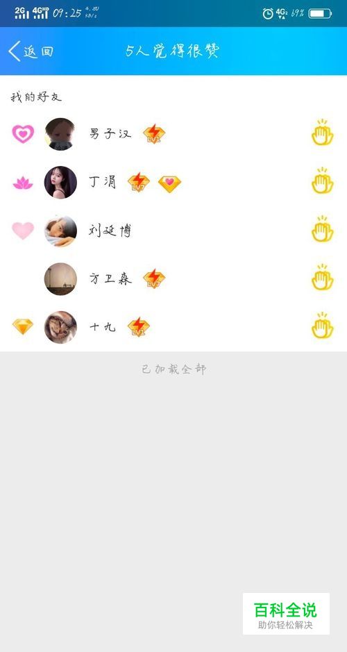 好友名字的后面,会显示哪些人赞你,显示黄色的说明击掌了。