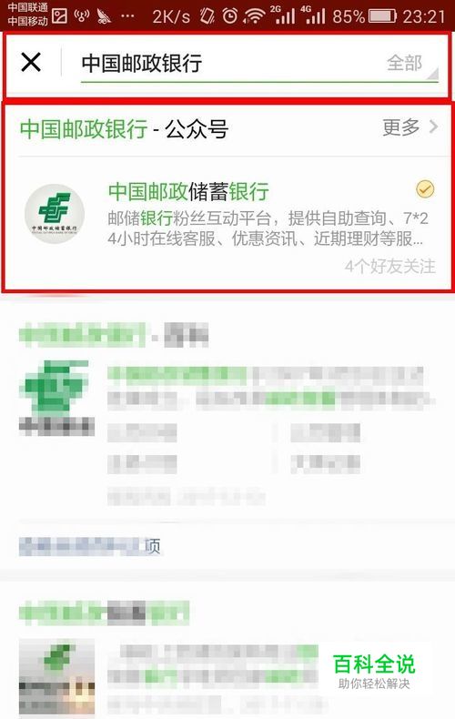 小鱼用邮政银行作为示例,搜索邮政银行公众号并添加关注,进入公众号。