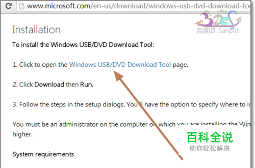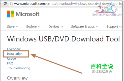 去搜狗搜索一下Windows USB/DVD Download Tool,选择进入微软官方网站下载。进入后如图点击Installtion.