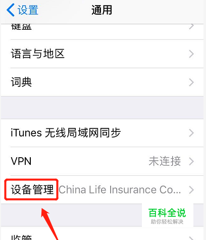 打开通用页面,iOS 11的通用界面是下图所示的,和之前的版本会有较大的区别,往下拉动页面我们会看到有一项"设备管理";