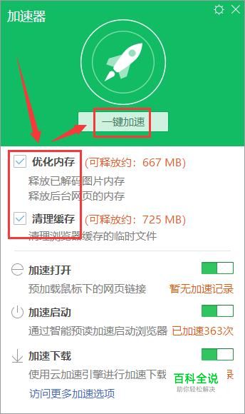在弹出菜单中选中“优化内存”和“清理缓存”,点击上方的“一键加速”,这样就能清理浏览器占用的缓存和垃圾了。
