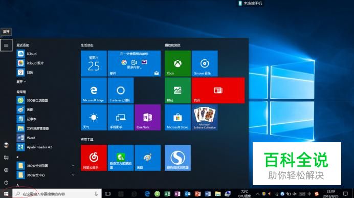 启动Windows 10操作系统,如图所示。点击任务栏"开始"按钮,用于弹出开始菜单。