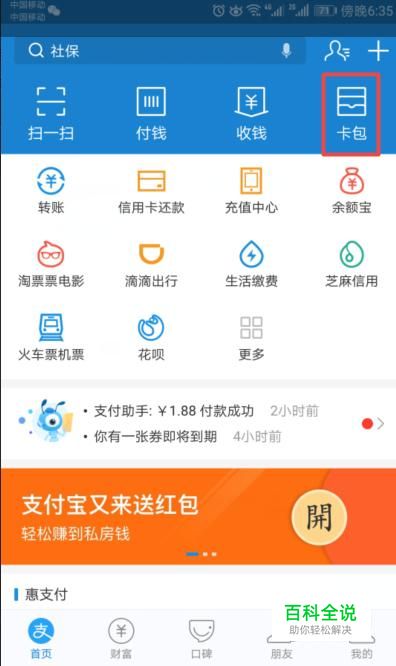 首先,我们打开我们的支付宝,然后我们点击卡包;