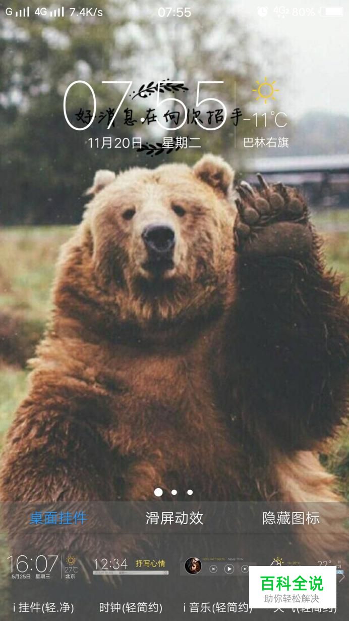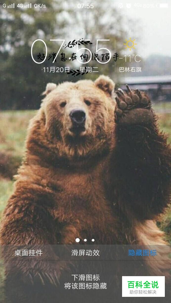 解锁桌面,进入后,长点桌面,会出现以下界面,在底端,有一系列的菜单,其中有“隐藏图标”这一项。