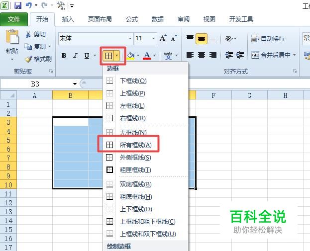 然后我们点击边框按钮边上的下拉箭头,弹出的界面,我们点击所有边框;