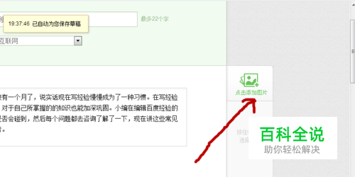 解决办法二:等待一小段时间,或者关了在从草稿箱打开。百度经验的草稿箱是每隔几分钟就会自动保存的,大概是5分钟吧,不是非常确定。小编这时往往会等到上方出现:**时**分自动保存了草稿之后直接关掉经验,再从草稿箱那里进去就能添加图片了。