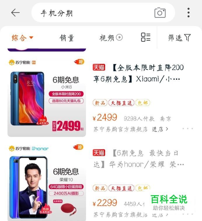 在搜索栏中输入“手机分期”,在出现的搜索结果中找到自己想买的手机,点击进入