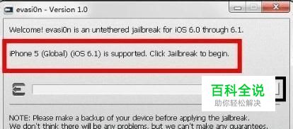 打开你下载好的evasi0n,并确保你的已经用USB连将你的iPhone5设备连接至你的电脑。(初次打开exe文件时,会自动解压,稍等即可)