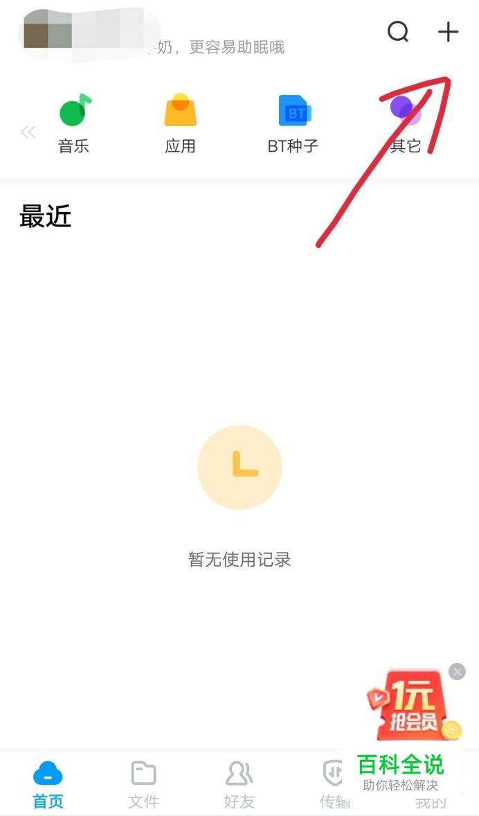 打开手机百度网盘,点击右上角的“+”,如下图。