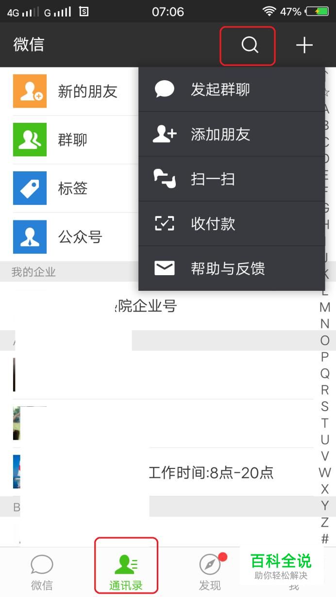 我们知道,微信和QQ不一样,不能直接搜索群号码或者群名称申请入群,不过我们可以通过搜索公众号、文章等的方法,找到群,关注并加入。首先,我们打开微信,点击“通讯录”,点击上方搜索图标。
