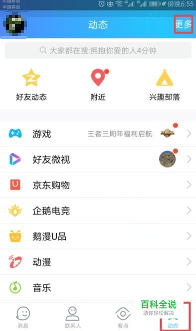 首先,我们打开我们的QQ,然后我们点击动态,之后我们点击右上角的更多;