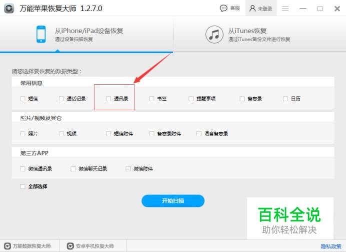 运行软件,待软件识别连接上手机后,会显示出数据类型,可以看到有短信,照片,通讯录,视频等数据,勾选我们要的类型-通讯录进入下一步。