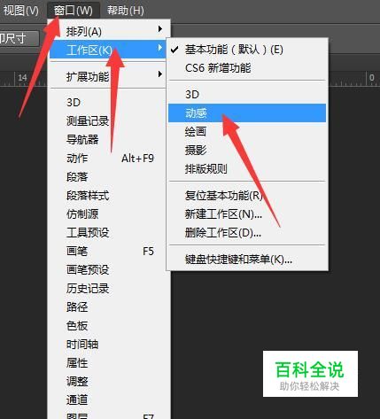 点击窗口菜单,在弹出的菜单中点击工作区,在向右弹出的菜单中点击动感。