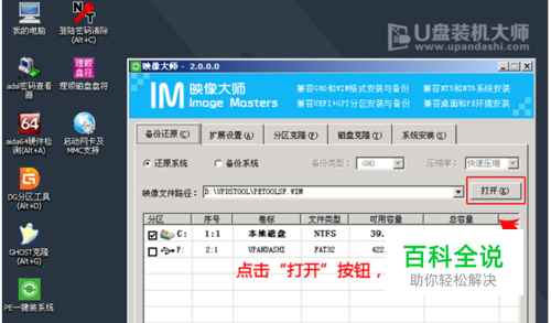 双击打开“PE一键装机”工具,点击“打开”找到下载后的镜像文件。单击选择c盘为系统安装盘,点击“确定”选项。