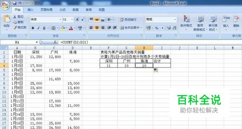统计广州数据,在单元格G4中输入=COUNT(C2:C21),按回车键,得到的结果是10。 统计珠海数据,在单元格H4中输入=COUNT(D2:D21),按回车键,得到的结果是10。