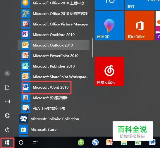 首先,我们点击电脑桌面左下角的微软按钮,弹出的界面,我们找到word,然后我们点击打开它;