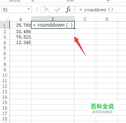 使用excel打开我们的文件,然后选择单元格,并在单元格内输入“= rounddown()”函数,如图所示: