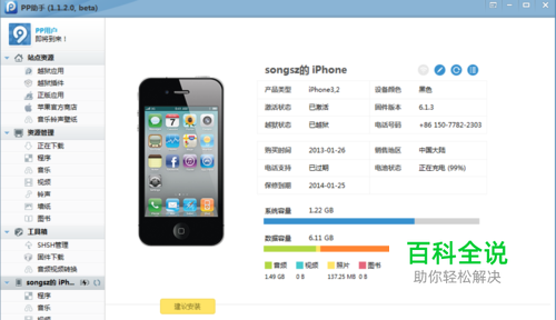 通过数据线,将手机连接电脑,直至PP助手中出现设备信息,表示连接成功: