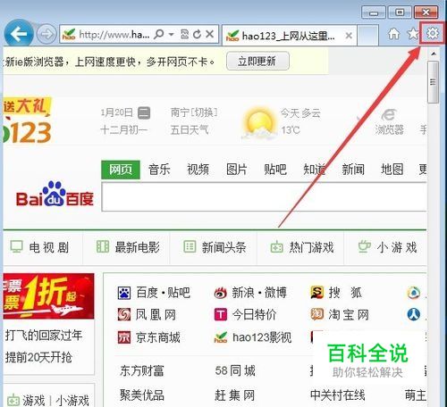 这里只演示IE浏览器的解决办法,首先我们打开电脑上的IE浏览器,然后点击浏览器右上角的齿轮符号 如图