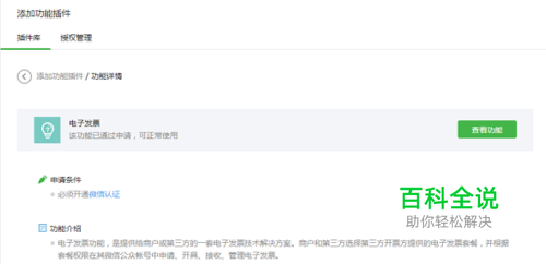 先开通电子发票功能。登录微信公众平台后台,在功能插件中添加电子发票。