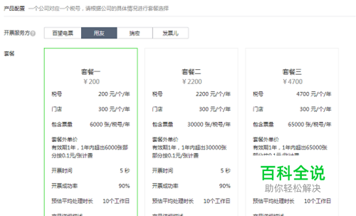 1、一个公司对应一个税号,根据你需要的开票量,选择电子发票服务方的套餐。目前的开票服务方有百望电票、用友、瑞宏、发票儿四个。每个服务方提供3个套餐。最低200元6000张,最高8000元100000张。