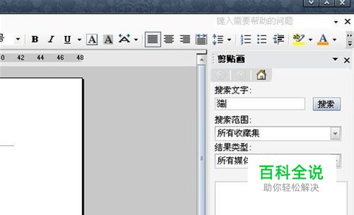 在“剪贴画”任务窗格中找到“搜索文字”,想要什么剪贴画,输入关键词。例如,我想搜猫的图片,就输入猫。