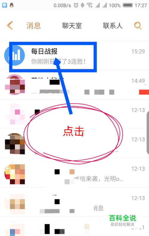 打开消息界面后,找到每日战报选项,一般都是置顶的,在最上面很容易就发现了,点击每日战报。如图所示