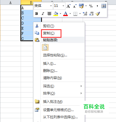 然后将鼠标点击到E1单元格,右击,选择“粘贴”选项,则数据就从A列复制到了E列