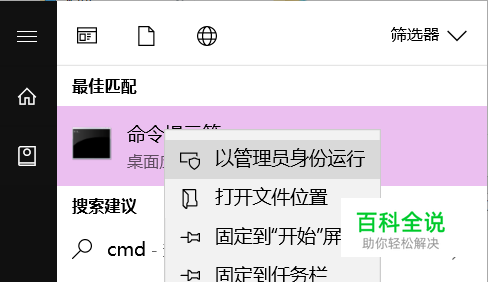 在开始菜单输入cmd(Windows 7在开始-运行中输入),右键单击命令提示符cmd,选择以管理员身份运行该程序。