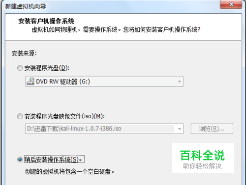 稍后我们再安装kali linux操作系统。这里我们选择稍后安装操作系统,点击“下一步”。