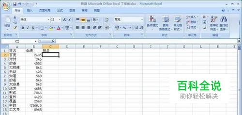 我这里使用的是OFFICE2007版本软件,打开EXCEL,建立一个工作簿,录入相关成绩内容,如果本身有的话这一步就可以省略了,如下图,我建立的表格内包含三列,姓名、业绩、排名,其中排名为空,等待我们的计算。