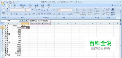 要计算排名,就得利用到EXCEL里面的统计函数RANK,如下图,我在C2单元格里输入公式RANK(B2,$B$2:$B$15),记住输入公式前别忘记输入“=”,RANK的在EXCEL里面的解释是:返回某数字在一列数字中相对于其他数值的大小排位。这里面注意“数字”两个字,我下面的公式的作用是,利用B2到B15里面的数据来跟B2的数值进行对比,从而来得到一个排名的结果。