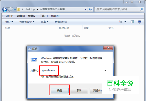 运行程序打开后如下图所示,在打开后面的输入框里输入gpedit.msc ,然后点击下面的确定按钮,如下图红色方框标示