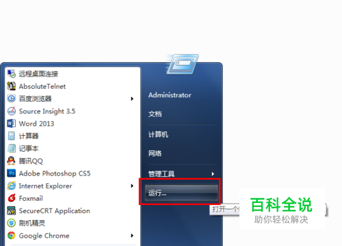 打开系统的开始菜单,如下图所示,打开后,在里面选择“运行”
