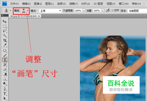在ps左侧工具栏选中“仿制图章工具”,调整上面靠左的“画笔”尺寸大小(画笔尺寸调整的跟水印尺寸大致差不多),如下图所示: