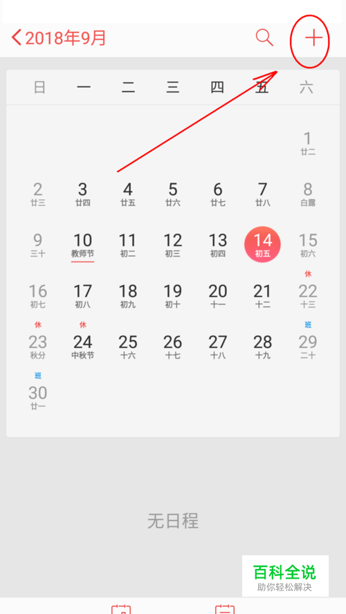 首先点开OPPO手机里的日历,然后点击日历右上角有个红色的”+“。(如下图)