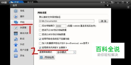 在弹出的选项设置界面,如下图所示,我们进入“网络”选项(红线1)设置界面,勾选上“启用娱乐风向标(含搜索)”选项(红线2),然后单击“确定”按钮