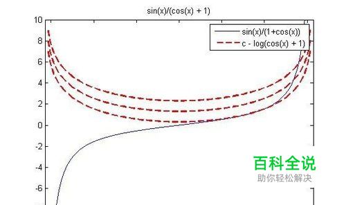 第五,在第四步脚本的基础,以被积函数f1=(sin(x))/(1+cos(x))为例,显示c取1-3时原函数的图形,只需修改脚本如下: close all; clear all; clc syms x a c; f1=sin(x)/(1+cos(x)) f2=[sin(x),a^x; x^2,log(2+x)]; I1=int(f1,x)+c I2=int(f2,x)+c ezplot(f1,[-pi,pi]);hold on; xx=linspace(-pi,pi); for cc=1:3 I11=subs(I1,c,cc); plot(xx,subs(I11,x,xx),'--r','LineWidth',2);hold on; ylim([-10,10]) end legend('sin(x)/(1+cos(x))',char(int(f1,x)+c))